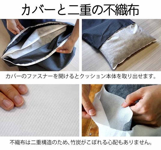 カバーのファスナーを開けるとクッション本体が取り出せるようになっており、クッション本体の不織布は二重構造になっているため、中身の竹炭がこぼれる心配を軽減しています。さらに、内部の竹炭を動かすことで高さ調整が可能で、お客様それぞれの体に合った最適な使用感を提供します。