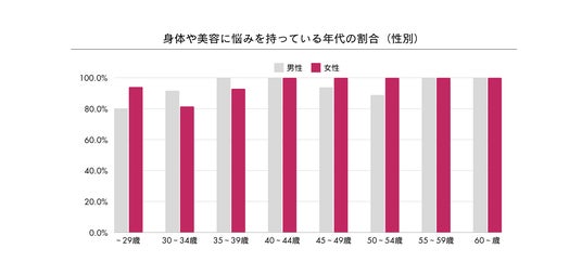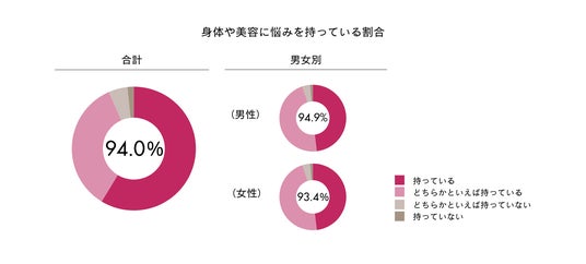 その取り組みの一貫で、2024年8月に「身体や美容に関する悩み」に関するアンケート調査(※1)を実施いたしました。そしてその結果、約94%の方が何らかのお悩みを抱えていることが明らかになりました。特に、年齢を重ねるにつれて増加する健康や美容の悩みは、生活の質や未来への安心感に大きな影響を与えていることがわかりました。