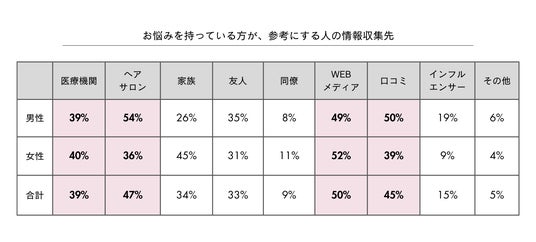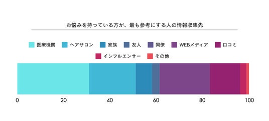 具体的には、健康や美容の情報収集先として、医療機関30%、WEBメディア24%、ヘアサロン19%、口コミサイト12%とする結果が出ており、専門的なアドバイスへのニーズが非常に高いことがうかがえます。