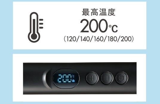 髪質や希望のスタイリングに合わせて、温度は120℃/140℃/160℃/180℃/200℃の5段階で調節が可能です。温度調節は+と-のボタンで操作するシンプルな設計です。設定した温度は本体中央のパネルにデジタル表示され、一目でプレートの温度状態が分かります。
