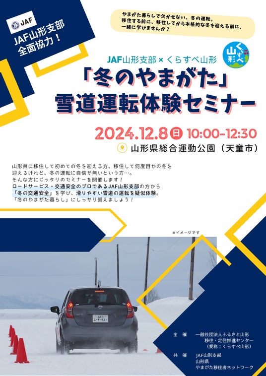 JAF(一般社団法人日本自動車連盟)山形支部(支部長 高橋 修)は、くらすべ山形(一般社団法人ふるさと山形移住・定住推進センター)が主催し、12月8日(日)に山形県総合運動公園で開催される「冬のやまがた」雪道運転体験セミナーに講師として協力します。