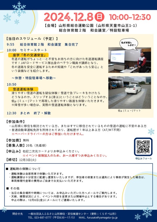 セミナーは、「山形県に移住を検討している」という方、「すでに移住しているものの雪道運転に不安を感じている」という方を対象とします。