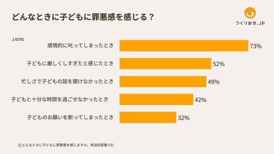 母親が子どもや家族に抱く罪悪感のことを「マミーギルト」といいます。罪悪感を感じる場面としては、「感情的に叱ってしまったとき」(73%)や「子どもに厳しくしすぎたと感じたとき」(52%)など、叱り方に関するものが上位に挙げられました。また、「忙しさで子どもの話を聞けなかったとき」(49%)や「子どもと十分な時間を過ごせなかったとき」(42%)など、時間的な余裕のなさも要因となっているようです。