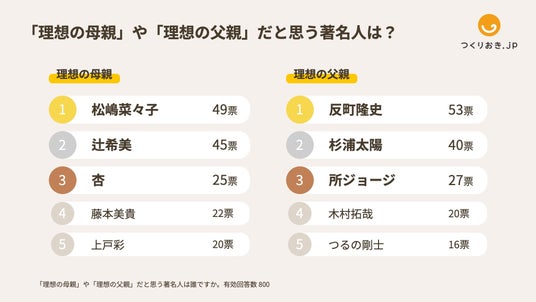 アンケートで「理想の母親・父親」を調査しました。「理想の母親」には松嶋菜々子さん、辻希美さん、杏さんがトップ3に選ばれ、「理想の父親」では反町隆史さん、杉浦太陽さん、所ジョージさんが選出されました。1位と2位は夫婦揃ってのランクインとなりました。