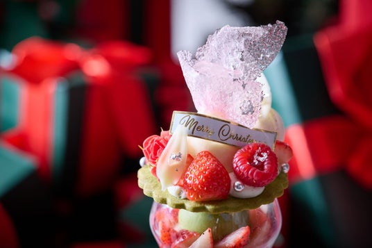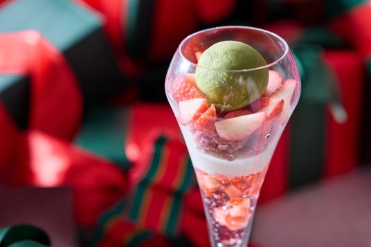 上段はフレッシュいちごやミルクアイス、銀箔をあしらったピンク色のオパリーヌを使用。下段は抹茶アイスやいちごのチョコレートクランチ、いちごのコンカッセ、いちごのシャンパンジュレなどを使用した、ホリデーシーズンにふさわしいご褒美パフェに仕立てました。