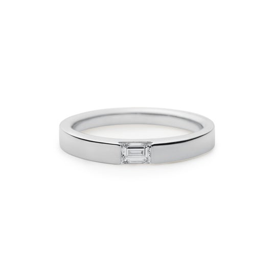 長方形のシェイプとシャープなラインが特徴のバゲットカットダイヤモンド、平打ちアームにあしらったモダンなマリッジリング。