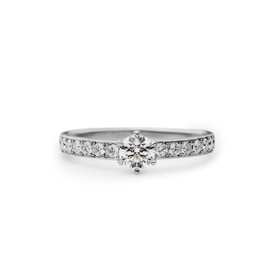 瑞々しい煌めきのセンターダイヤモンドに寄り添う大きめのメレダイヤが、リュクスな輝きで華やぎを添えるエンゲージメントリング。