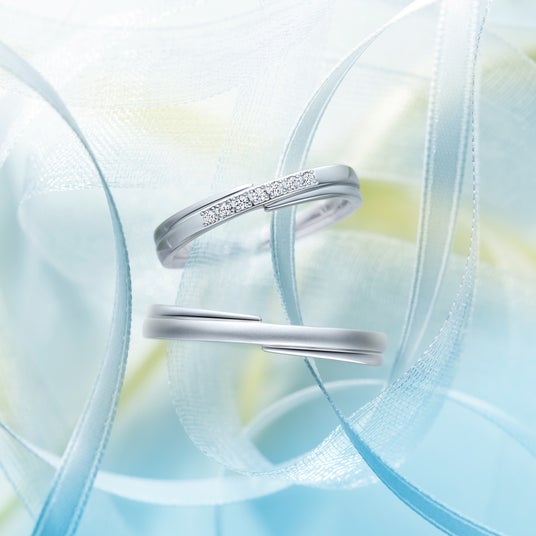 細身のリングを積み重ね、「出会ったふたりが一緒に年月を重ねていく」「幸せを重ねていく」ことを表現したマリッジリング。