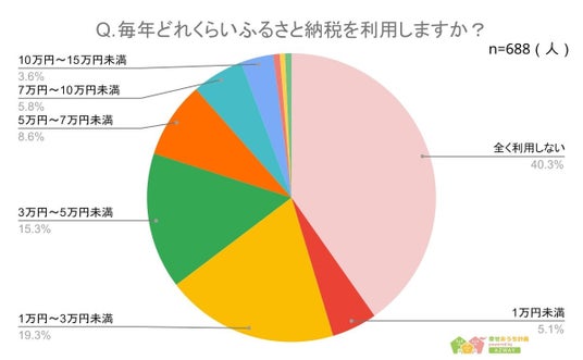 続いて、「毎年どのくらいふるさと納税を利用しているか」について聞いたところ、「1万円~3万円未満」が19.3%、「3万円~5万円未満」が15.3%、「5万円~7万円未満」が8.6%となっており、利用者の3分の2程度を占めていることがわかりました。また、全体で見るとわずか5.6%ですが、10万円以上ふるさと納税を利用している人もいることがわかります。