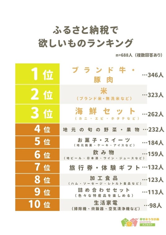 株式会社AZWAY(本社:東京都新宿区、代表取締役:井口梓美)は、10代から60代以上までの688人を対象に「ふるさと納税で欲しいもの」についてアンケート調査を実施し、そのデータをランキングにしました。