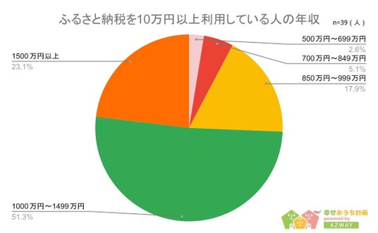 10万円以上ふるさと納税を利用している人がどのような人なのか知るため、対象者39名の年収を分析したところ、年収1,000万円以上の人が7割以上を占めていることがわかりました。ただ、年収500万円~699万円の人もおり、制度を詳しく知れば工夫次第でふるさと納税を最大限活用できることがわかります。