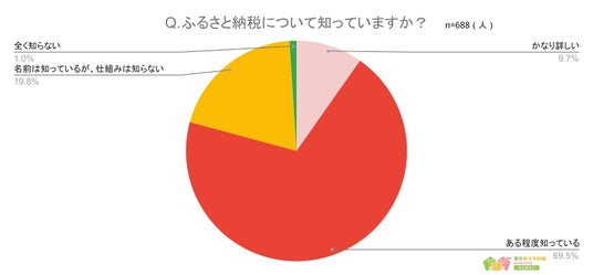 10代から60代以上までの回答者688人に「ふるさと納税を知っているか」について聞いたところ、「ある程度知っている」と答えた人が最多で69.5%、「名前は知っているが、仕組みは知らない」と答えた人は19.8%、「かなり詳しい」は9.7%という結果になりました。