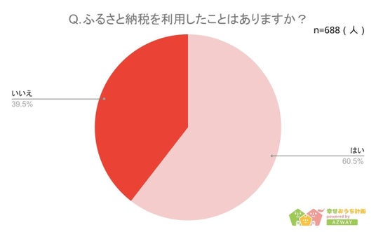 また、「ふるさと納税を利用したことがあるか」について聞いたところ、「はい」が60.5%、「いいえ」が39.5%という結果に。6割の人がふるさと納税を経験していることがわかりました。