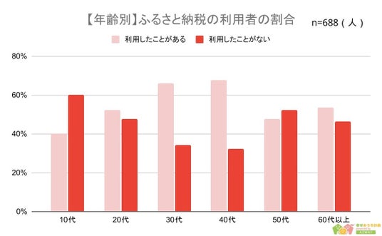 さらに、ふるさと納税の利用者の割合を年代別に見たところ、税金を収める金額が高く子育て世代も多い30代、40代の人たちの利用者が多いことがわかりました。10代では利用したことがない人の方が多く、20代、50代、60代以上では、利用者と非利用者の間にそこまで大きな差は見られませんでした。