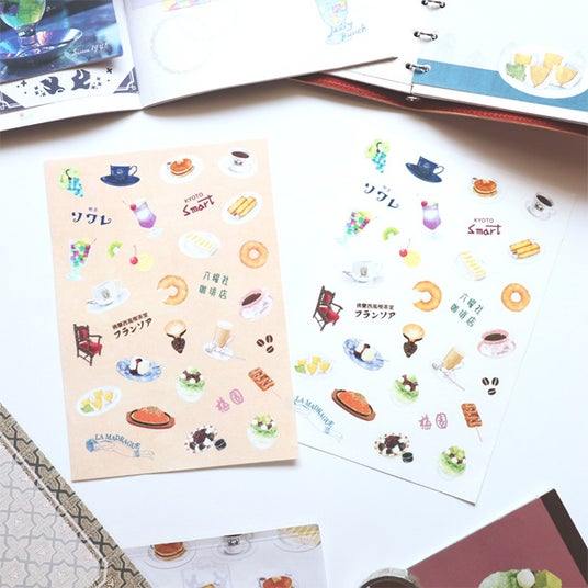 京都の喫茶店とコラボした「夢ミル京都喫茶巡り」シリーズのマスキングシール。6 店舗のイラストが 1 枚に入っています。お好きに切ってお使いいただくシートタイプ。