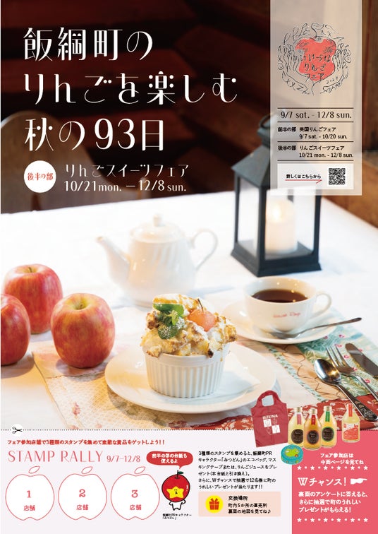 長野県飯綱町は、10月21日(月)から12月8日(日)まで、町内27店舗、町外4店舗で飯綱町のりんごを使った期間限定のスイーツが味わえる「りんごスイーツフェア」を開催。参加店舗を3カ所まわってスタンプを集めると、りんごジュースまたは、飯綱町PRキャラクター「みつどん」のエコバッグ、マスキングテープのいずれか1つをプレゼント。さらにWチャンスで、抽選で12名様に町のうれしいプレゼントが当たります。
