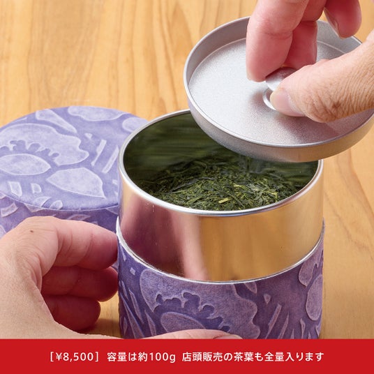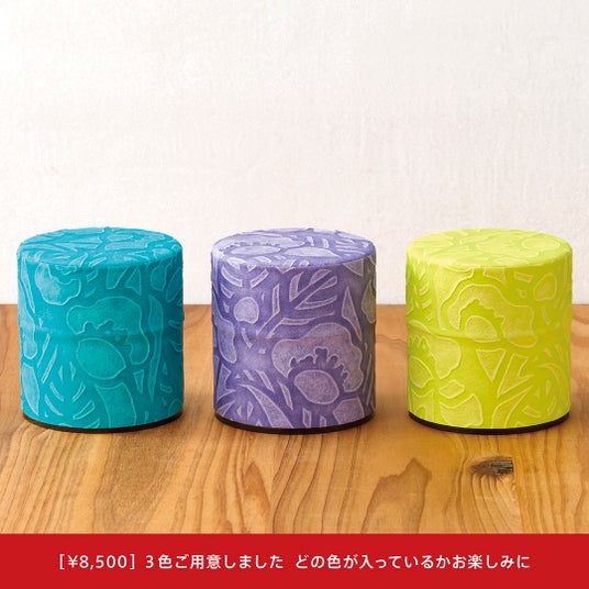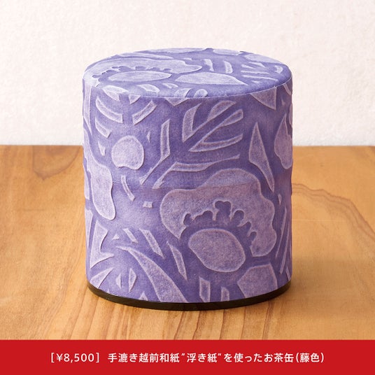 手漉き越前和紙「浮き紙」を使用したお茶缶は¥8,500セット限定(全3色のうちどれか1色が入っています)