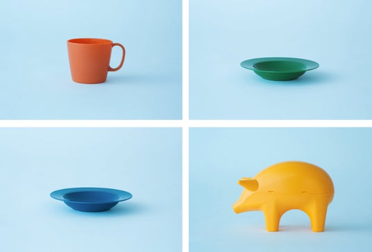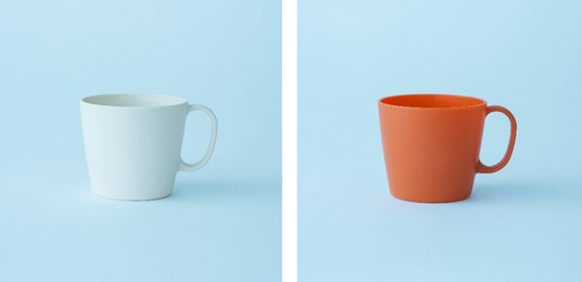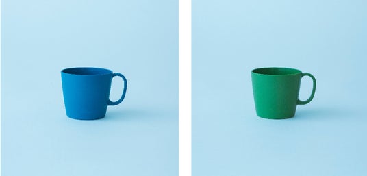 「ロングライフ」を実現するため、いつの時代も使ってもらえるような、シンプルで飽きのこないデザインになっています。プレートの底面やマグの飲み口の厚みを厚くすることで、プラスチックでありながらしっかりとした陶器のような質感を表現しています。色は4色展開。素材にはマスバランス方式によるバイオマスポリプロピレンを配合しています。