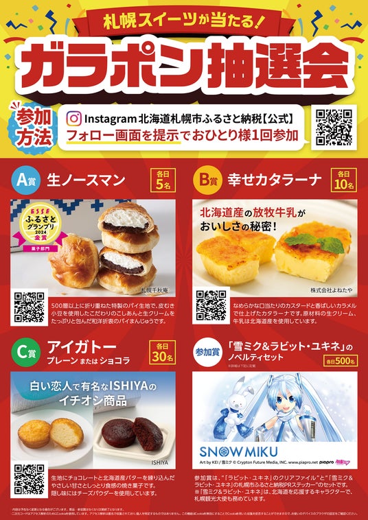ガラポン抽選会では、いまメディアで話題沸騰中の返礼品「生ノースマン」をはじめ、イチオシの札幌スイーツを景品としてご用意します。さらに、抽選会に参加された方には、札幌観光大使として活動中の「ラビット・ユキネ」のクリアファイルと「雪ミク&ラビット・ユキネ」の札幌市ふるさと納税PRステッカーをセットでプレゼントします。