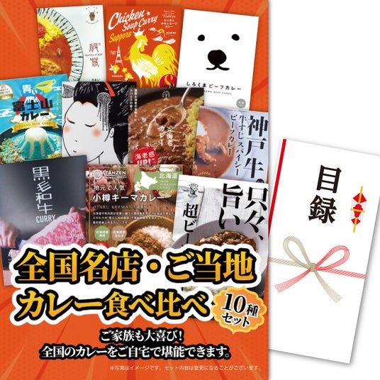 パネル付き目録 全国名店・ご当地カレー食べ比べ 10食セット 9,130円全国の名店やご当地のカレー10種類をご自宅で食べ比べできるパネル付き目録。法人コンペの協賛品や、目玉景品などに。