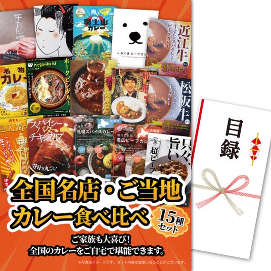 パネル付き目録 全国名店・ご当地カレー食べ比べ 15食セット 11,880円全国の名店やご当地のカレー15種類をご自宅で食べ比べできるパネル付き目録。15種セットはインパクト大なので、目玉景品にぴったりです。