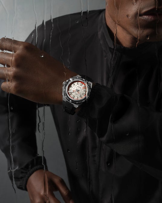 斬新でありながら身につけたくなる、現代的なシルエットの「デファイ エクストリーム ダイバー」は、緻密に計算されたケースデザインによって深海で優れた性能を発揮します。直径42.5mmの角張ったケースの素材に採用されたチタンは、傑出した重量対強度の比率を誇り、塩分を含む海水に対して優れた耐食性を持っています。ケースには、飽和潜水を想定したヘリウムエスケープバルブが備えられています。固定式の12角形ベゼルの上に配されたブラックセラミック製の逆回転防止ベゼルは、グローブをはめていても操作しやすいよう、縁に溝が刻まれています。また、光の少ない水中でも容易に表示を読み取れるよう、ベゼルの刻印にはスーパールミノバが塗布されています。