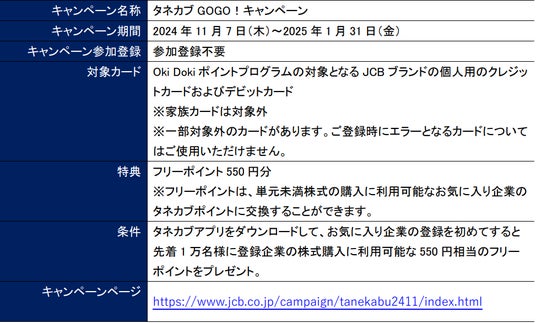 株式会社ジェーシービー (本社:東京都港区、代表取締役兼執行役員社長:二重 孝好、以下「JCB」)とマネックス証券株式会社(本社:東京都港区、取締役社長執行役員:清明 祐子、以下「マネックス証券」)は、ポイント投資による1株からの「株式投資体験」を提供し、企業のファン育成を支援する『タネカブ(TM)』(以下「タネカブ」)を2024年11月7日にリリースいたします。