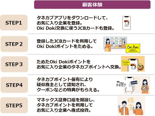タネカブは、JCBカード(※)の利用で付与されるOki Dokiポイントとの交換やタネカブアプリの利用により獲得できるタネカブポイントで、参画企業の株式を1株から購入することが可能なサービスです。