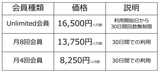 価格もリーズナブルで種類も豊富にご用意しております。月4回会員・8,250円(税込)からご用意しており、都度ご利用可能な回数券もご利用いただけますので、ご自身のライフスタイルに合わせたプランをお選びいただけます。
