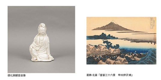 ■日本・東洋美術では、明治工芸から陶磁、書画、浮世絵。日本から中国への注文品である明の祥瑞向附、現代作家の曜変杯、北斎の浮世絵 「富嶽三十六景より」甲州伊沢 暁、そして伝来のある徳化窯観音坐像など注目すべき作品が出品されます。