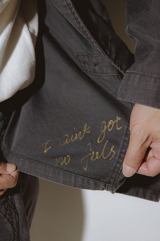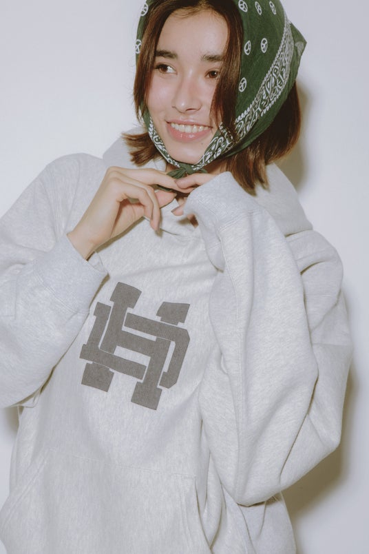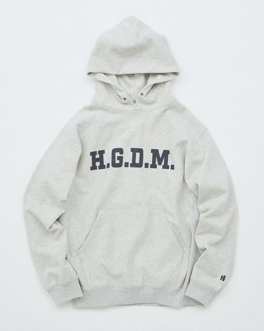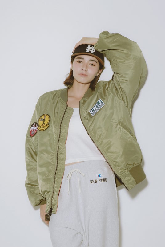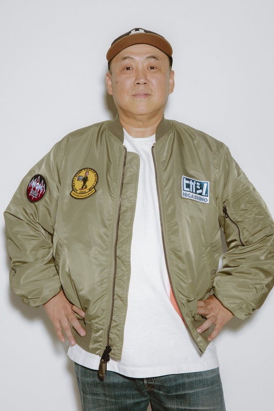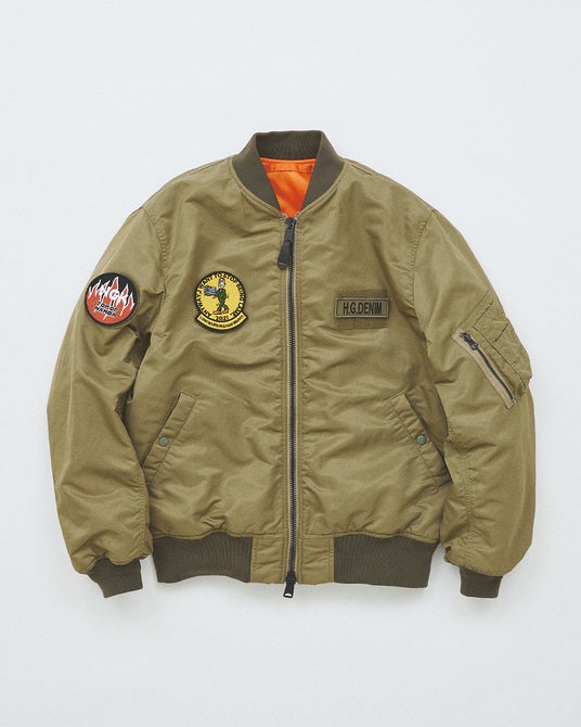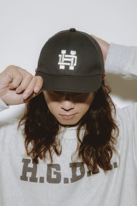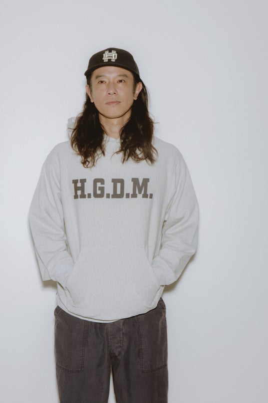 今回のコラボでは、シリーズ初のアウターを含む計8型を展開。オリジナルのワッペンが付属したMA-1(3万8000円)、東野デニムを表した(HD)(HGDM)ロゴをフロントにデザインしたリバースウィーブフーディー(2型共に1万5000円)、発売と同時に即完売したバックサテンベイカー(1万8000)、バックサテンジャケット(2万7000円)を新色ネイビーに変更、デザインは前回から継続でストレスを耐えるときにポケット外側を強く握りしめて色あせたストレス苦し跡加工、また今回ディスカッション中に生まれた「フィーリングなんてない」という東野さんのメッセージを裏地に1点1点ハンドペイントをデザインしたセットアップ。ベースボールキャップ(3型7000円~80000円)など8型ラインナップ。