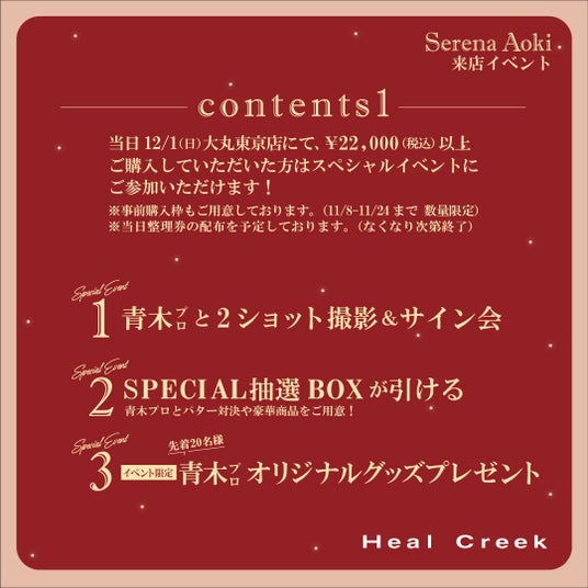 ・イベント当日12/1(日)にHeal Creek大丸東京店にて、¥22,000(税込)以上ご購入していただいた方はスペシャルイベントにご参加いただけます。