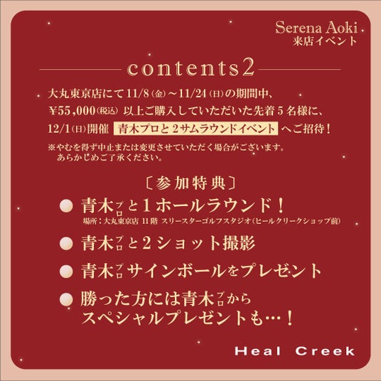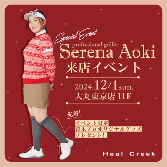 株式会社グリップインターナショナル(本社:神戸市、代表取締役会長兼社長 桑田 隆晴)のオリジナルゴルフウェアブランド「Heal Creek / ヒールクリーク」はHeal Creekウェア契約の青木瀬令奈プロをゲストに迎え、2024年12月1日(日)にHeal Creek大丸東京店で来店イベントを開催いたします。