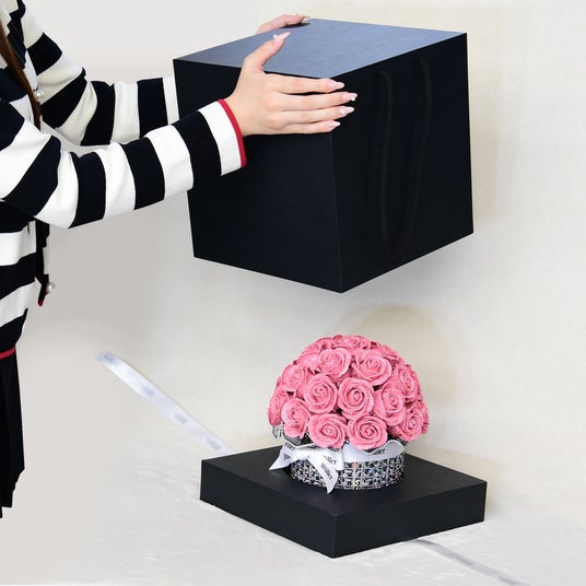 ●世界のSNSで話題沸騰の最新トレンド、光が当たるとキラキラと美しく反射するグリッターローズもラインナップ。グリッターローズは国内自社生産品で、使用するラメ風素材を厳選し、配し方にも工夫を重ねました。