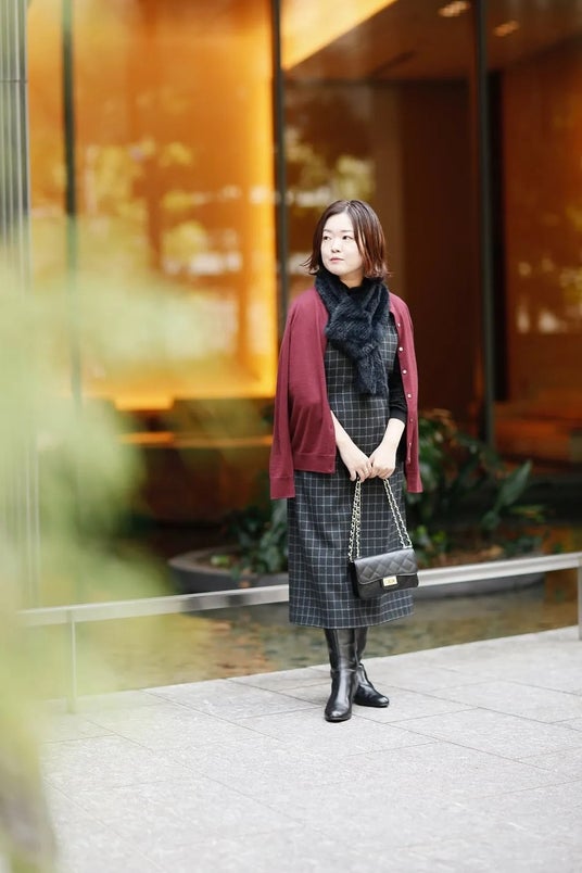 上質なキャッシュウールニットは、お仕事~アフター5のドレスアップスタイルにもマッチ。ダークグレー&ブラックのシャープなコーディネートに、深みのあるワインカラーのカーデを羽織るだけで、簡単に彩りがプラスできます。また、目線を上に集めることで、スタイルアップ効果も◎。ジャンパースカートは、付属のベルトリボンを後ろで結んで、ウエストにメリハリをつけつつ、フロントはすっきりとした印象に。