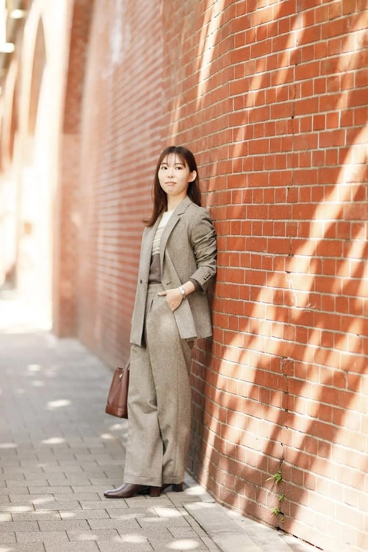 リラクシーなセットアップとコーディネートした旬顔のオフィススタイル。メンズライクなホームスパン素材も、フェアアイル柄ニットとの組み合わせによって、堅苦しくなく柔らかな印象に。繊細な柄行ならカジュアル度も控えめです。グラデーションのような色使いで、ブラウンコーデでも顔回りを明るい印象にしてくれます。