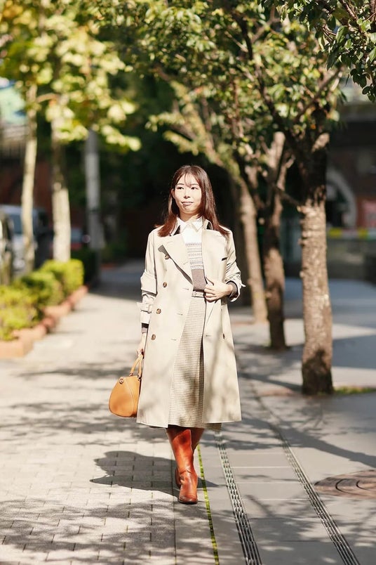 休日は、秋の柄合わせを愉しむレイヤードスタイルでおでかけ。ホワイトのシャツを重ね着することで、ニットコーデも知的で品のある印象に。スカートは、フェアアイル柄と同系色のガンクラブチェックを選ぶことで、柄同士も自然に馴染みます。アウターにベージュのトレンチコートを合わせれば、秋のトラッドコーデの完成です。