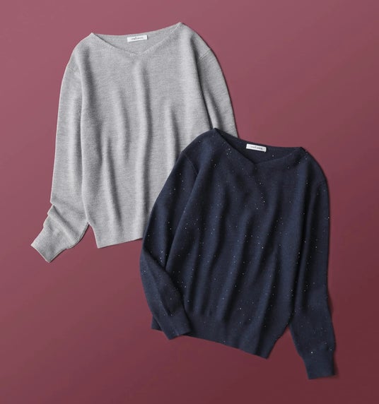今シーズントレンドのスパンコールを使用したデザインニット。細番手のスーパーファインメリノウールに、小粒のスパンコールを撚糸することで、チクチク感も抑え、品のある印象に仕上げています。浅いVネックにすることで、デコルテがきれいに見え、1枚でも気兼ねなく着用可能です。