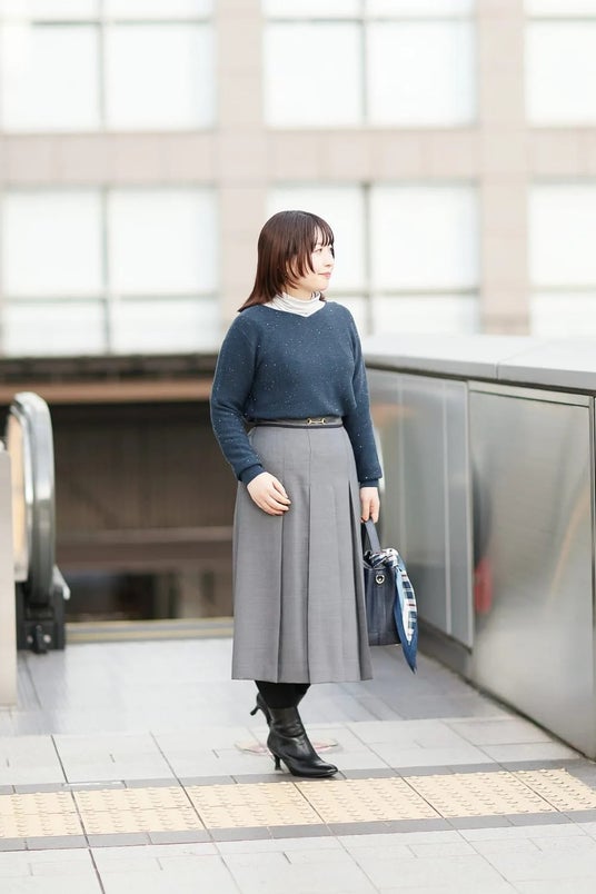 オフィスで着用するなら、鉄板のネイビー・グレー・ブラックのベーシックカラーで統一。程よくきらめくスパンコールが、定番の色合わせに華やぎをプラスしてくれます。タートルネックトップスを重ね着して、防寒かつ肌見せ控えめに。トップスはインして、スカートのバックルデザインを見せることが地味見えを防ぐひと工夫。