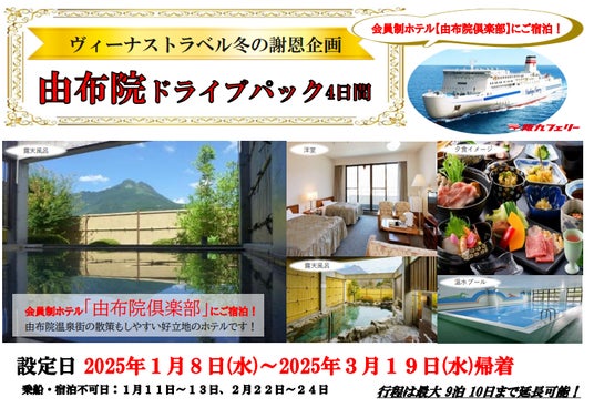2025年1月~3月のご出発で、阪九フェリー、大阪・泉大津港もしくは兵庫・神戸六甲アイランド港から出港し、会員制ホテル「由布院倶楽部」に宿泊できる「由布院ドライブパック」を販売いたしました。