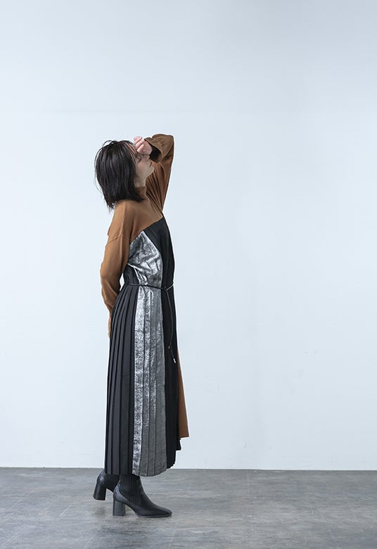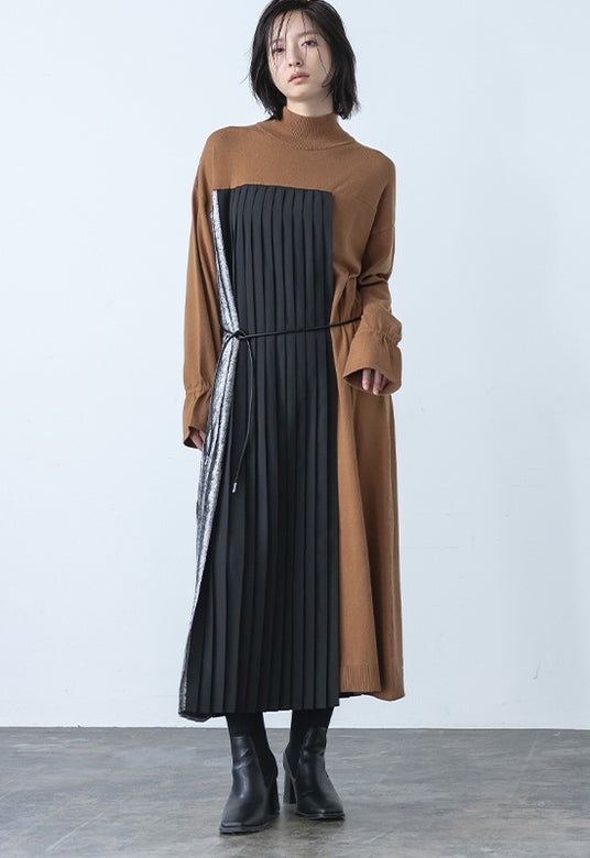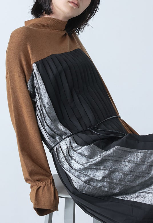 ハイネックのワンピースに配色布帛のプリーツ生地をドッキングしたデザイン。