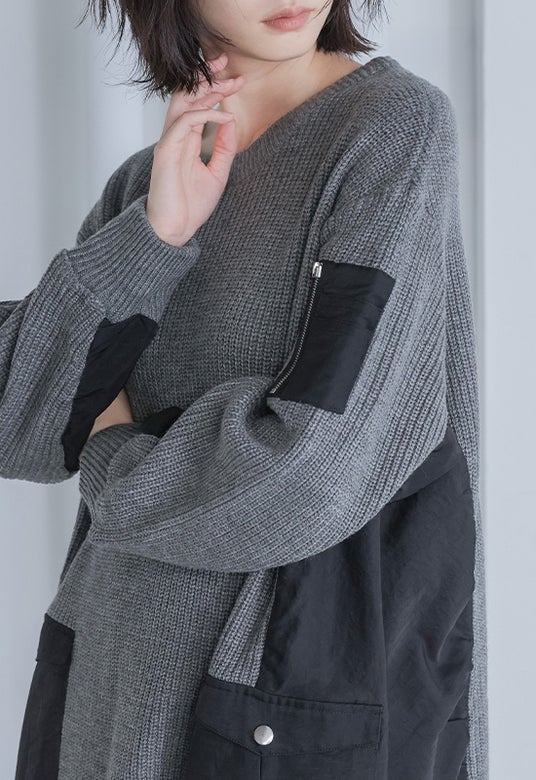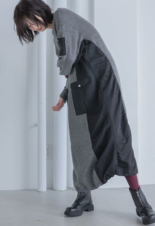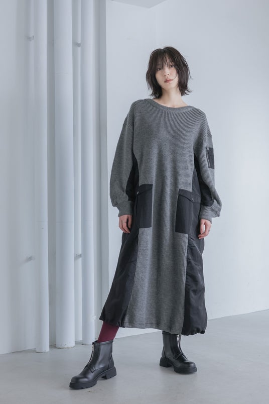 ニット生地とナイロン生地を、配色でドッキングしたワンピース。
