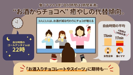 その点、チョコレートなどのお菓子に移行している傾向にあるのは、万人に受けるおいしさや幸せな気持ちに浸れるという感情面への影響だけでなく、限られた自分時間の中での利便性の面で、30~40代女性のニーズに合っているからと考えられます。