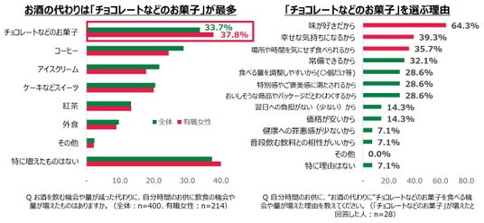 お酒を飲む機会・量が減った代わりに、自分時間のお供に飲食する機会や量が増えたものがあるかどうか聞いたところ、「チョコレートなどのお菓子」が最も多く、3人に1人(33.7%)が増えたと回答しました。特に有職女性では4割(37.8%)に上りました。お酒の代わりに増えた理由として、「味が好きだから」(64.3%)、「幸せな気持ちになるから」(39.3%)、「場所や時間を気にせず食べられるから」(35.7%)が理由として挙がりました。お酒よりも味が好きな人が多く、幸せな気持ちになりやすいお菓子への代替が進んでいると見られます。