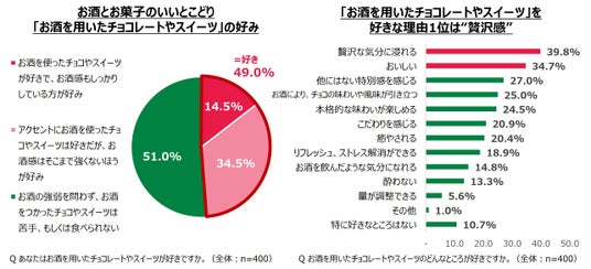 「お酒を用いたチョコレートやスイーツ」について聞いたところ、「好き」と答えた人は全体の約半数に上り、また、好きな人の中でもチョコレートやスイーツへのお酒の効きの強さで好みが分かれることがわかりました。好きな理由としては「おいしい」(34.7%)という味覚だけではなく、「贅沢な気分に浸れる」(39.8%)等、日々頑張る自分へのご褒美の位置づけにしている方が多いことが見受けられます。