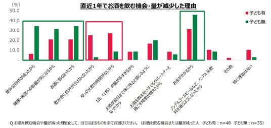 お酒を飲む機会・量が減った理由としては、就業の有無よりも子どもの有無による差が最も大きく、子どものいる女性は「飲み会に自分が行けなくなったから」(25.0%)、「ゆっくりと飲む時間がないから」(27.1%)が平均より高く、子どものいない女性は「飲み会自体が減ったから」(34.3%)、「健康・美容への影響が気になるから」(31.4%)、「お酒に弱くなったから」(34.3%)、「お金がかかるから」(45.7%)が平均より高い結果になりました。子どものいる女性は時間の余裕のなさが影響し、子どものいない女性は健康や美容などへのお酒のデメリットの浸透やコロナ後の飲み会減少が大きく影響していると考えられます。