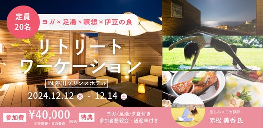 地域密着のプロジェクトコーディネートを手掛ける株式会社micro development(本社:静岡県賀茂郡東伊豆町、代表取締役社長:守屋真一)は、「足もみ&デトックスヨガ」を考案・提供する赤松美香氏をヨガ講師として招き、「リトリートワーケーション in 熱川プリンスホテル」を開催します。つきましては、本イベントへの参加者を募集します(募集締切:11月24日(日)23:59まで)。