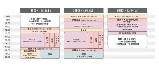 1日目は、オリエンテーションと絶景ヨガ、足湯体験、懇親会を実施。2日目には、ヘッドスパや足つぼヨガなどでリラックスしながらも仕事に取り組む時間を確保します。最終日は、稲取細野高原での絶景ヨガや足湯、源泉ゆで玉子づくり等の手作り体験を通じて、心身ともにリフレッシュしていただきます。