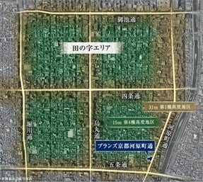 本物件が所在する田の字地区は、京都市の中でも多くの企業や金融機関、商業施設をはじめとする都市機能が集中する中心地として知られており、京都市内でも人気のエリアです。特に近年、外国からの観光客が増加し、京都市内での居住・滞在需要が高まる中、田の字地区は資産性の観点からも注目を集めています。なかでも本物件が面する河原町通は田の字地区のメインストリートのひとつであり、世界的ブランドや老舗百貨店が軒を連ねる「四条通」と、雄大な水景が広がる鴨川や歴史的名所が点在する祇園・東山エリアの間に位置することから人気を博しています。