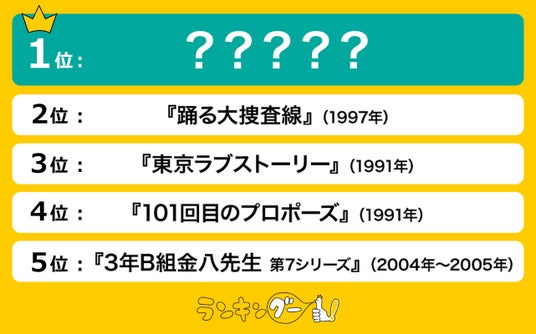 2位は平成の大人気刑事ドラマ!「踊る大捜査線」。3位には90年代の恋愛ドラマの金字塔「東京ラブストーリー」がランクイン。4位は武田鉄矢さん・浅野温子さんW主演のドラマ「101回目のプロポーズ」。そして5位にランクインしたのは、社会問題を取り上げた学園ドラマ「3年B組金八先生 第7シリーズ」でした。